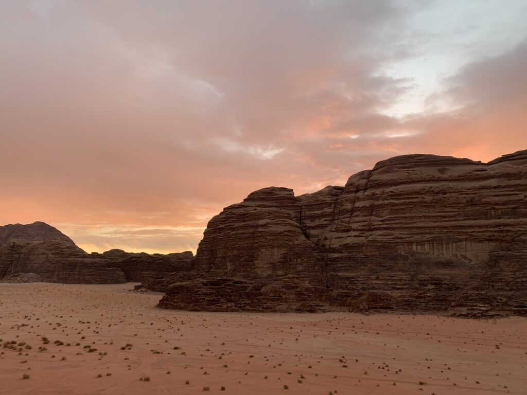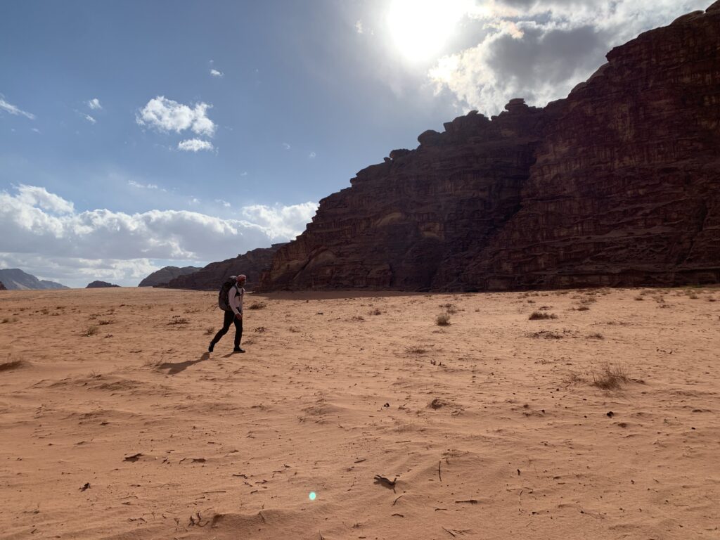 The Wadi Rum desert is unique as a considerable portion comprises mountains. However, your trek will primarily involve hiking through sand all day. The sand can be challenging, especially uphill, and walking on 4×4 tracks may not always be helpful. For fit hikers, plan on covering around 15 to 20 kilometers a day (we averaged 9 to 10-hour days) at most. We strongly recommend wearing light trail running shoes. Heavy boots will make it tougher, as you’ll sink into the sand.